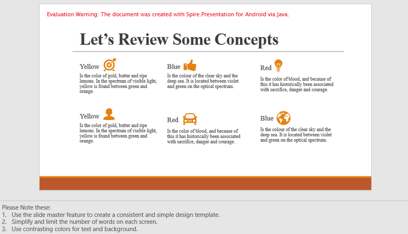 Free Spire.Presentation for Android via Java can be easily integrated into Android applications. |