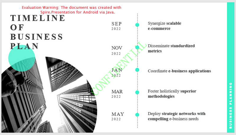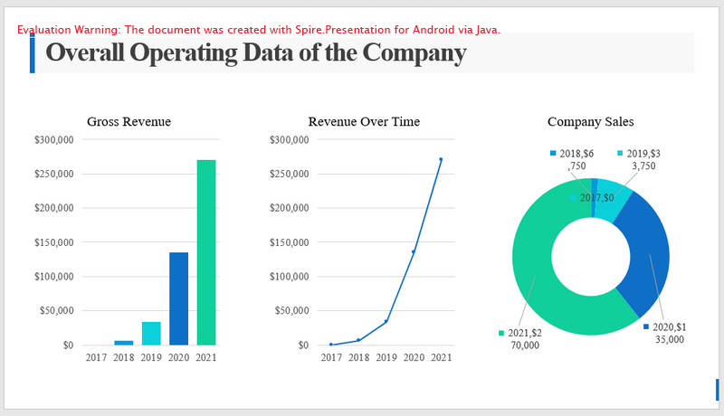 Free Spire.Presentation for Android via Java supports to process a variety of PowerPoint elements, such as slide, text, image, shape, table, chart, watermark, animation, header and footer, comment, note, SmartArt, hyperlink, OLE object, audio and video.Easy Integration