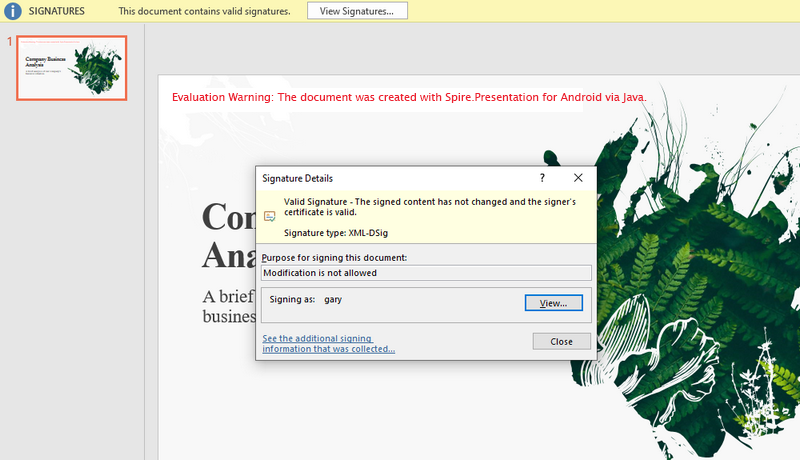 A digital signature provides assurances about the validity and authenticity of your presentation. Once a PowerPoint document is digitally signed, any changes to the document will invalidate the signature.