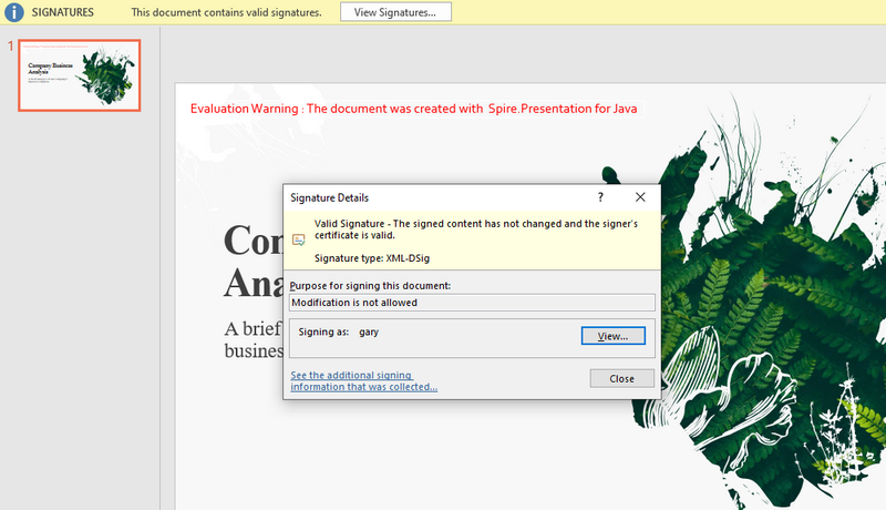 A digital signature provides assurances about the validity and authenticity of your presentation. Once a PowerPoint document is digitally signed, any changes to the document will invalidate the signature.