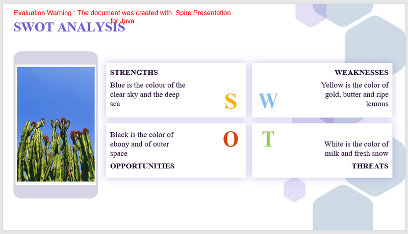 Free Spire.Presentation for Java is a professional PowerPoint API that enables developers to create, read, write, convert and save PowerPoint documents in Java Applications. As an independent Java library, Spire.Presentation doesn't need Microsoft PowerPoint to be installed on system.