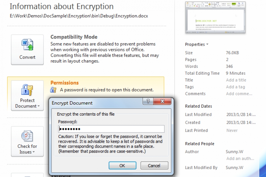 Spire.Doc for .NET, specializing in performing Word processing tasks for .NET, provides a Document.Encrypt method which enables users to encrypt Word. The overload passed to this method is string password. Firstly, load the Word document which is needed to protect. Secondly, invoke Document.Encrypt method to encrypt with password. Thirdly, save the encrypt document and launch for viewing. After debugging, a dialog box pops up and requires the password. Enter the password to open the document and the document information will be shown as following to tell users that it is encrypted.